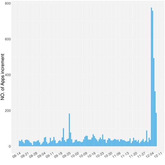 從8月到11月底,投放蘋果Search Ads廣告的App數(shù)量保持較為平穩(wěn)的增減浮動(dòng)趨勢(shì),但是12月6日(北京時(shí)間)“Basic”版本上線后,投放廣告的App數(shù)量開始迅速上升,當(dāng)天有近800款A(yù)pp都加入了Search Ads廣告投放的大軍。