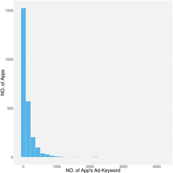 從App投放的關(guān)鍵詞數(shù)量統(tǒng)計(jì)來看,絕大部分App投放的關(guān)鍵詞數(shù)在0-100之間,少數(shù)App會(huì)投放500個(gè)以上關(guān)鍵詞??梢?,對(duì)于大多數(shù)廣告主而言,關(guān)鍵詞的選擇和出價(jià)仍然是一個(gè)制約性的難題。不過,相關(guān)專業(yè)人士了解到,目前愛比數(shù)據(jù)可以最多推薦1000個(gè)相關(guān)性較高的關(guān)鍵詞,很大程度解決了廣告主“選詞難”的問題。